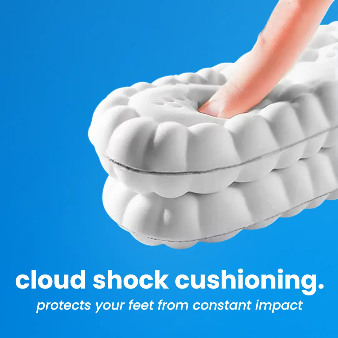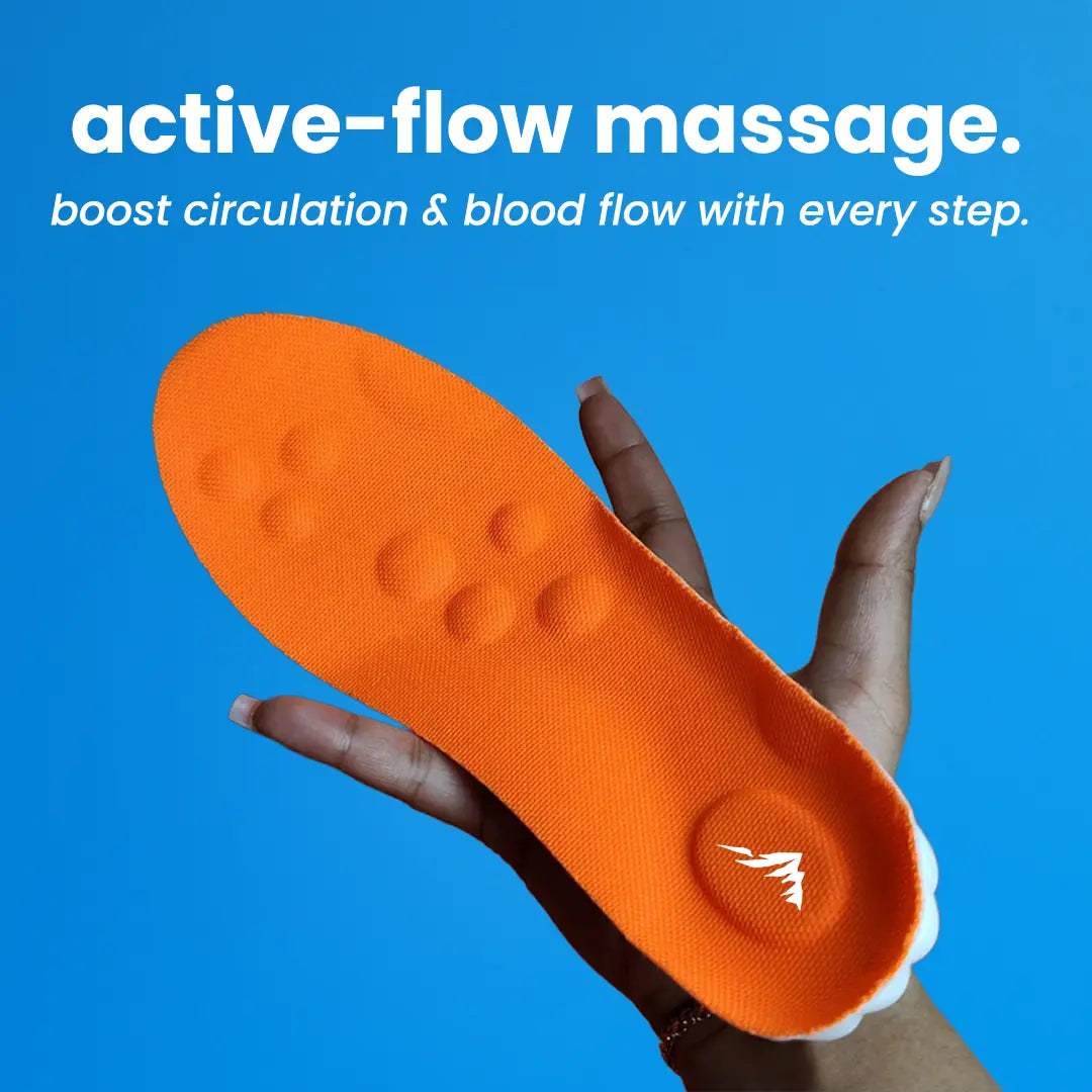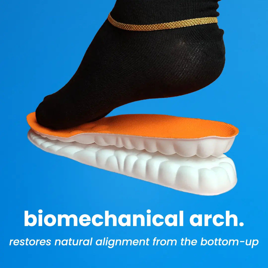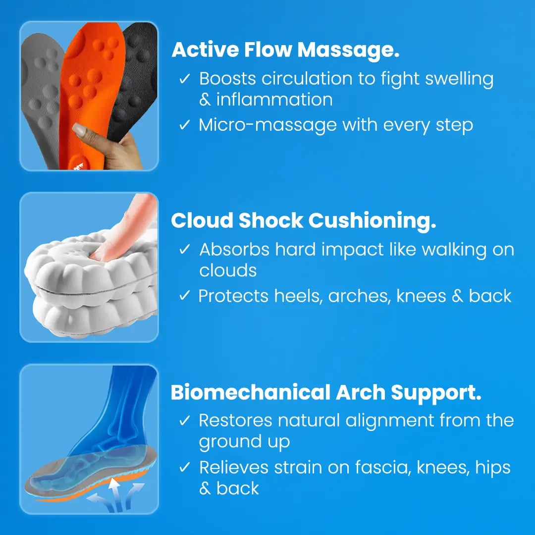 They combine cloud shock cushioning, active flow massage stimulation, and biomechanical arch support to relieve pain and restore your foundations from the bottom up.